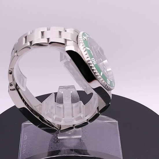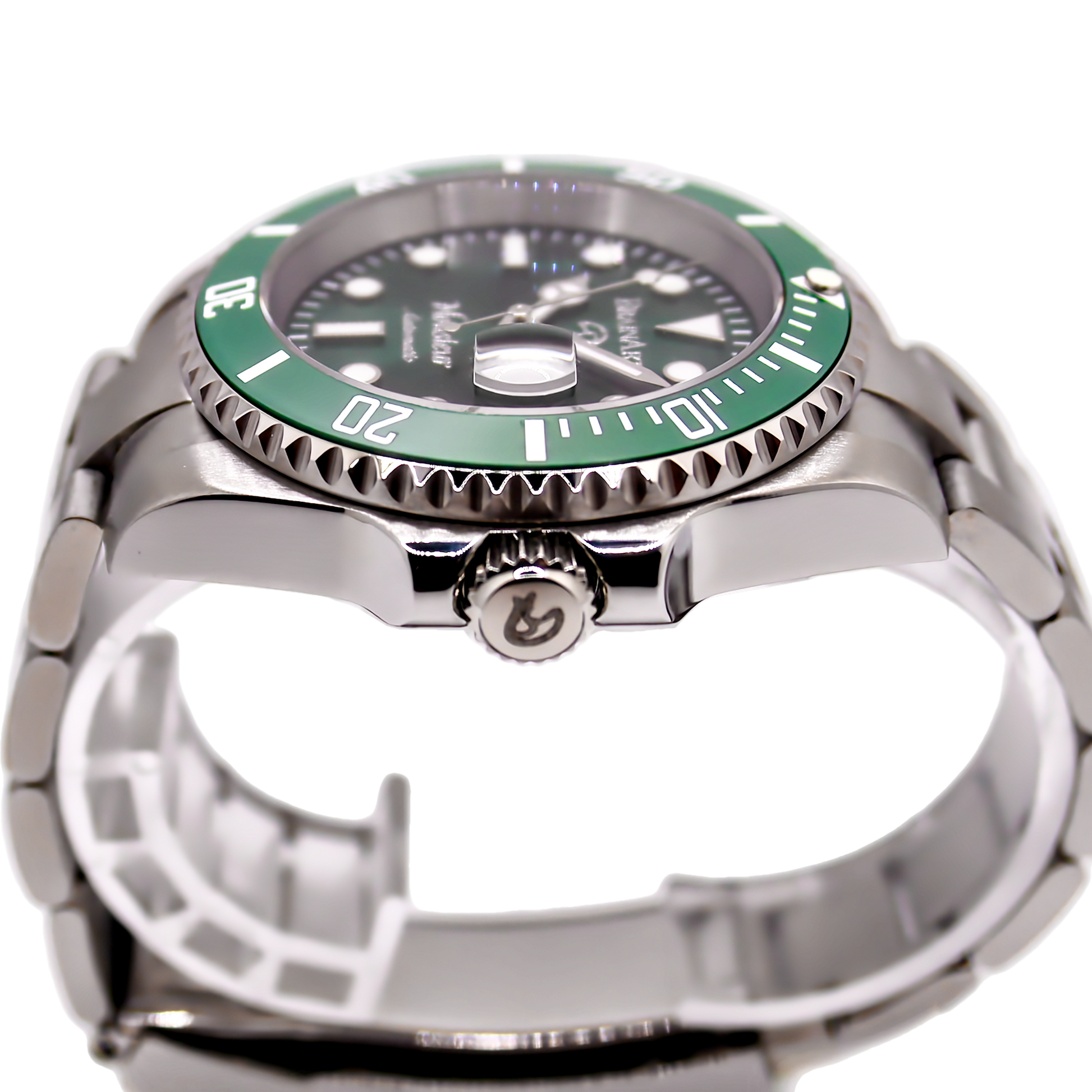 Montre automatique à mouvement PT5000 (clone de l'ETA 2824-2), 40 heures de réserve de marche, 4 Hz, boitier acier poli et satiné 904L étanche à 200m de 40 mm, couronne vissée, lunette tournante unidirectionnelle en céramique bleue, verre saphir traité anti-reflets, bracelet acier 904L. Index avec superluminova vert, aiguilles mercedes à superluminova bleu BGW9. Cadran bleu sunburst. Fond de boitier, couronne et boucle de bracelet gravés.