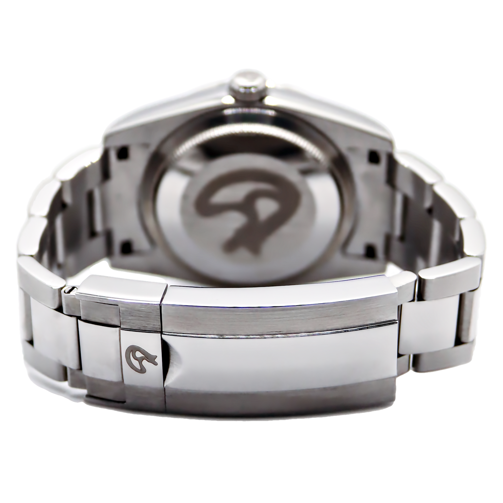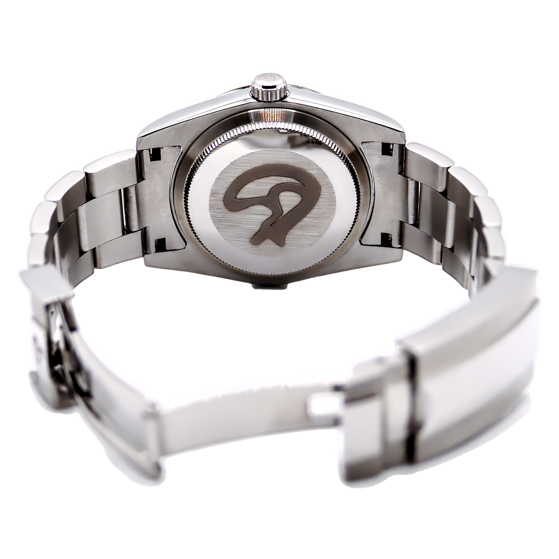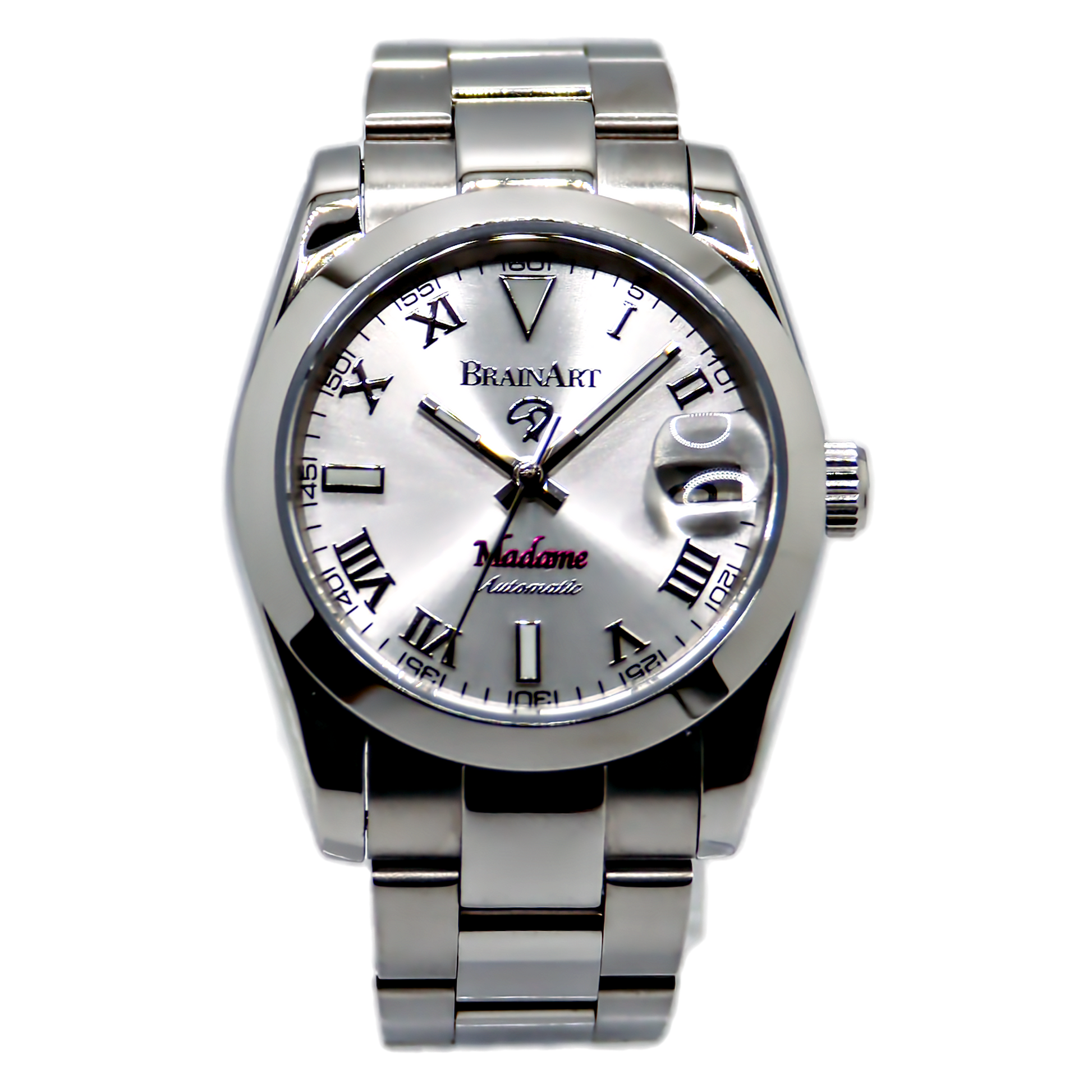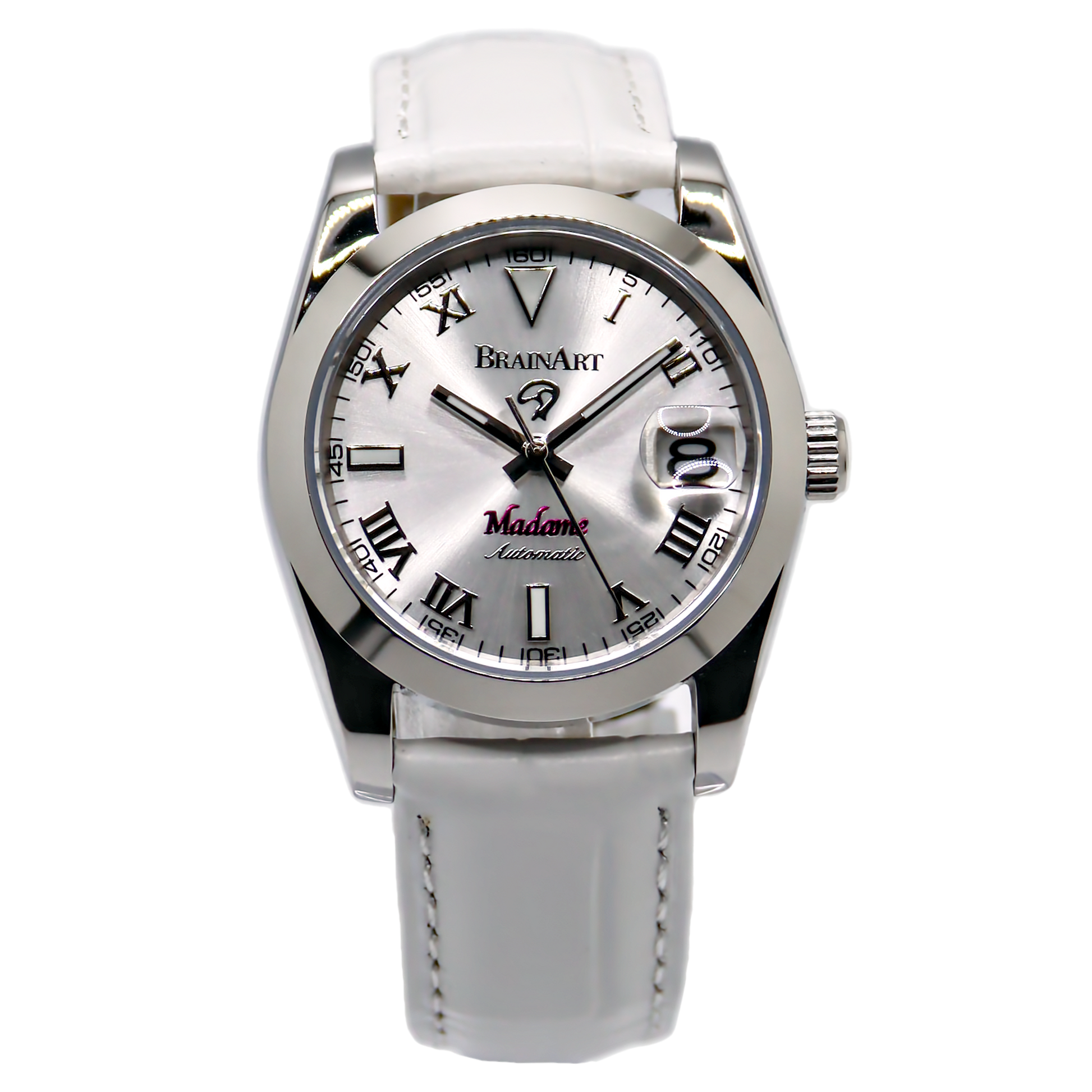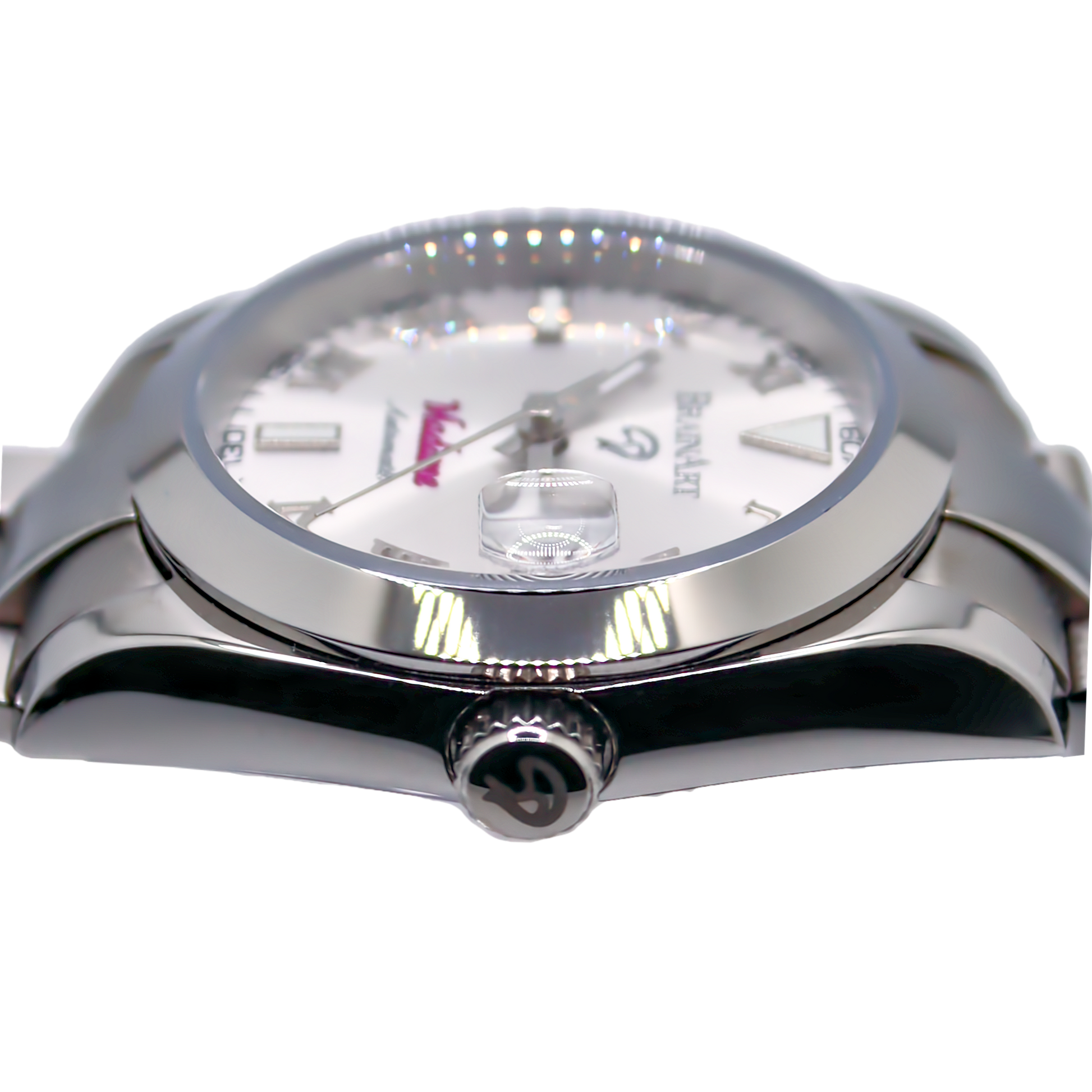 Montre automatique à mouvement Seiko NH35A, 42 heures de réserve de marche, 3 Hz, boitier acier poli et satiné 316L étanche à 100m de 36 mm, couronne vissée, verre saphir traité anti-reflet, fond de boite transparent en verre minéral, bracelet cuir rose, blanc ou acier poli/satiné. Index à chiffres romains avec superluminova vert à 6, 9 et 12 h, aiguilles batons à superluminova vert. Fond de boite et couronne gravés.