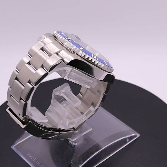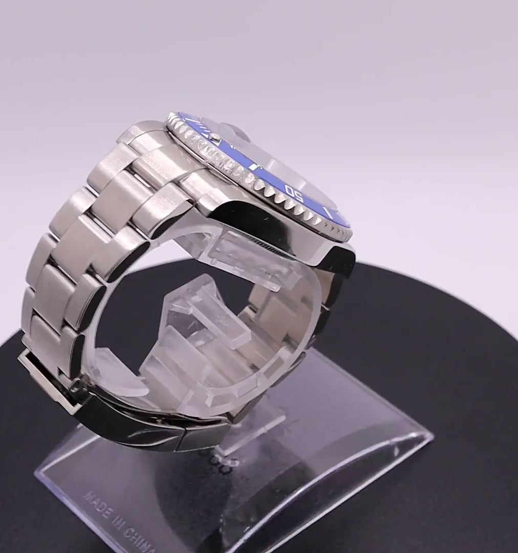 Montre automatique à mouvement PT5000 (clone de l'ETA 2824-2), 40 heures de réserve de marche, 4 Hz, boitier acier poli et satiné 904L étanche à 200m de 40 mm, couronne vissée, lunette tournante unidirectionnelle en céramique bleue, verre saphir traité anti-reflets, bracelet acier 904L. Index avec superluminova vert, aiguilles mercedes à superluminova bleu BGW9. Cadran bleu sunburst. Fond de boitier, couronne et boucle de bracelet gravés.