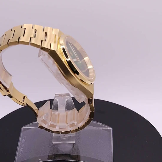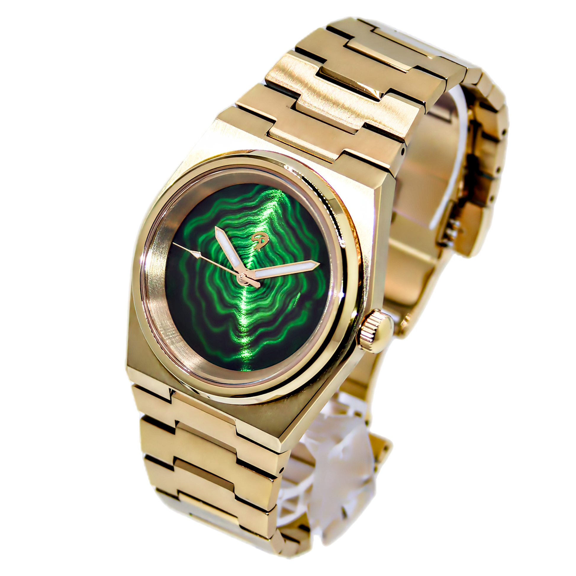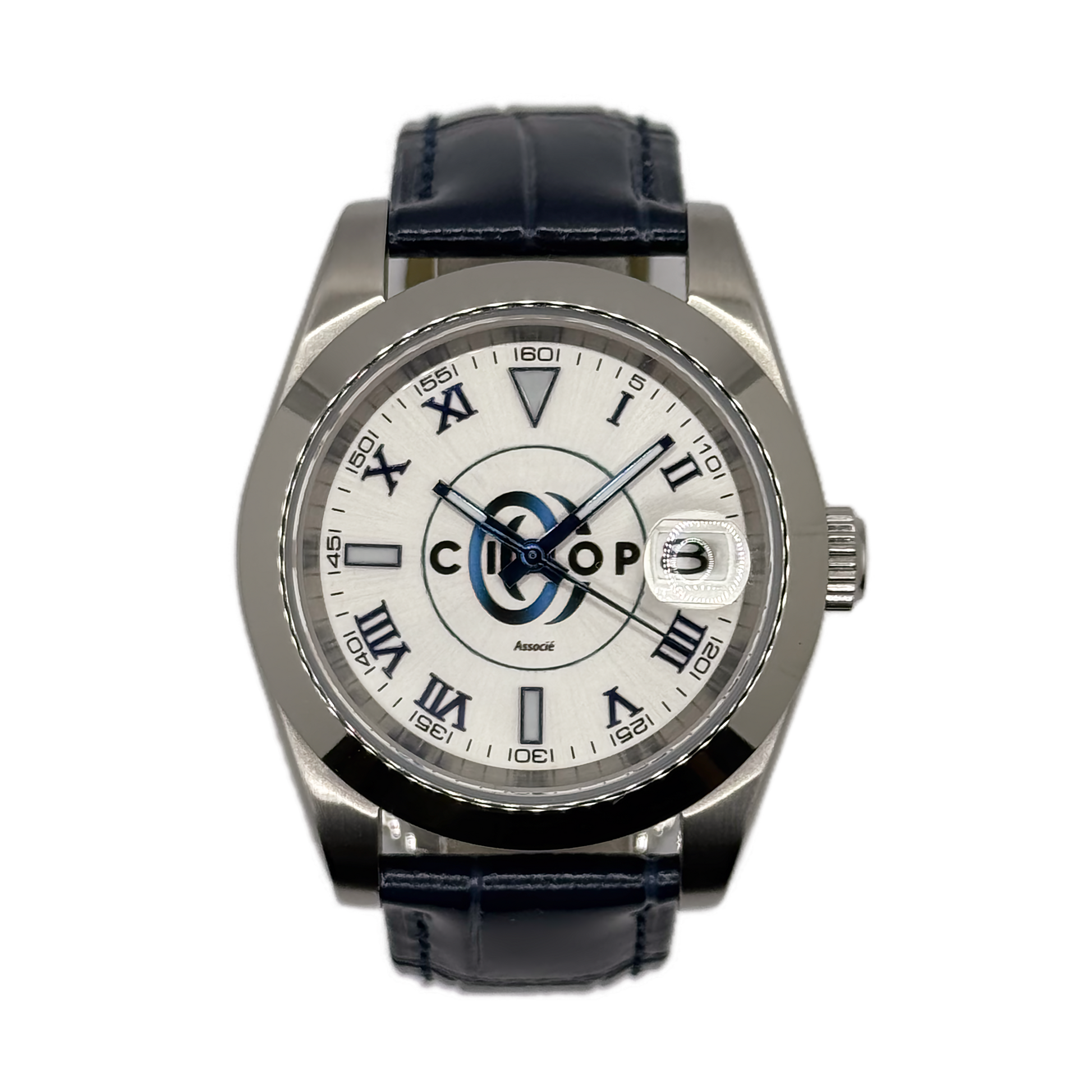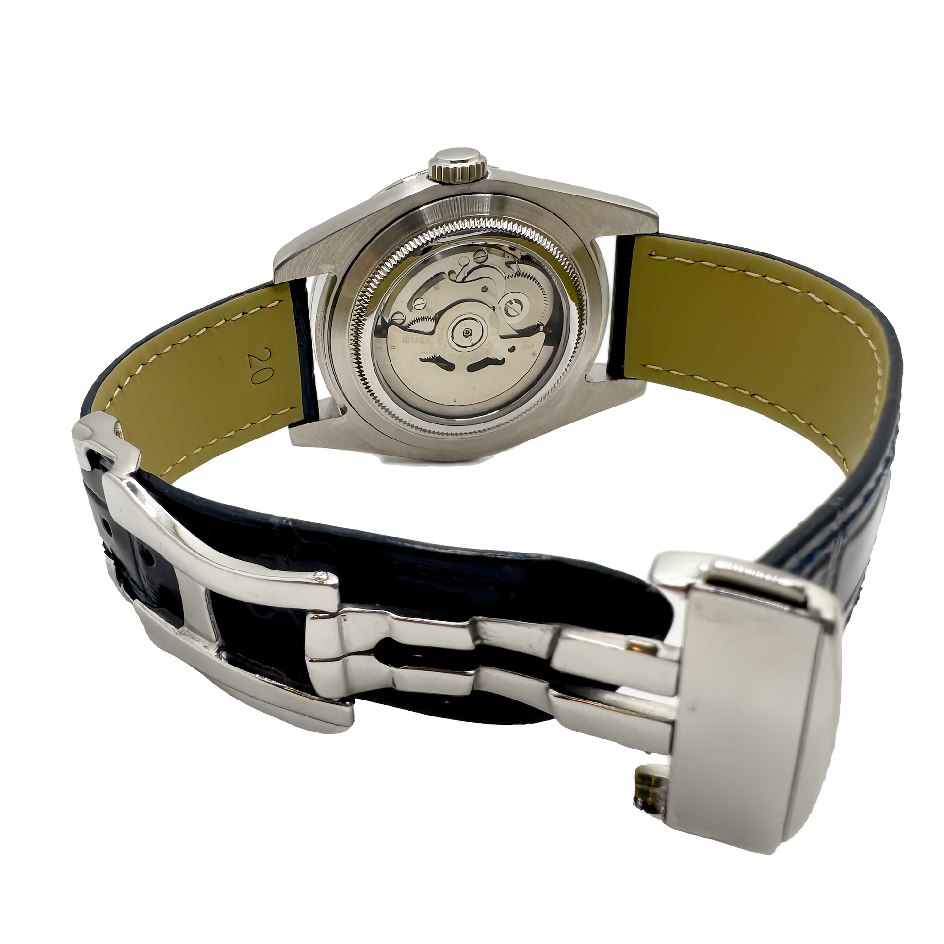 Montre automatique à mouvement PT5000 (clone de l'ETA 2824-2), 40 heures de réserve de marche, 4 Hz, boitier acier poli et satiné 904L étanche à 200m de 40 mm, couronne vissée, verre saphir traité anti-reflets, bracelet cuir, rubber ou acier 904L (au choix). Index bleus romains avec superluminova vert à 6, 9 et 12h, aiguilles type baton à superluminova vert. Fond de boitier, couronne et boucles de bracelet gravés.